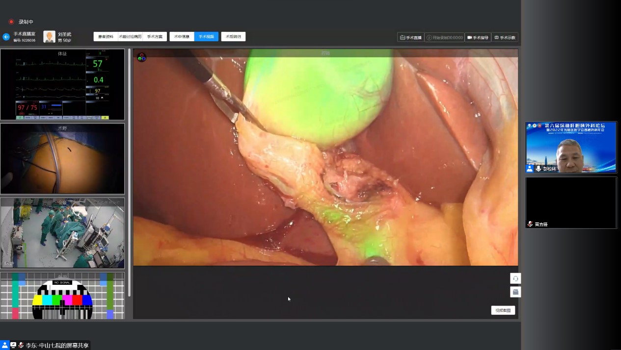 12月2日上午9时,在中山七院彭松林教授的主持下大会手术直播正式开始,中山七院汤地、邓刚、樊友文、谢炬平医师通过对连续三台荧光腹腔镜经脐隐疤痕胆囊切除术的手术直播,展示了“微微创”胆囊切除的优势,满足了患者对确保手术安全、减少手术创伤,隐藏手术疤痕,术后快速康复的要求,40余名外院学员参与手术直播及互动,线上累计2000余人观看。