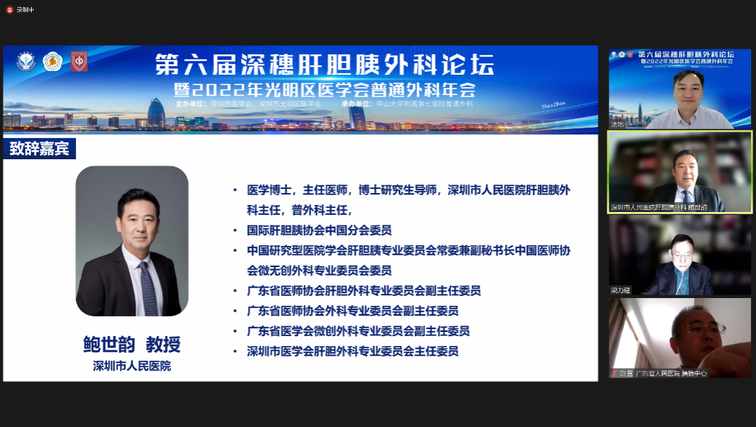 本次会议采取线上为主、线下为辅的同步开展模式,邀请了包括中山大学资深名医梁力建教授、前教育部器官移植重点实验室主任陈忠华教授、中山大学附属第一医院器官移植中心主任何晓顺教授、华中科技大学同济医院肝胆胰研究所副所长秦仁义教授、中南大学附属湘雅二医院刘威教授、复旦大学附属中山医院刘寒教授、深圳市医学会肝胆外科专业委员会主任委员鲍世韵教授以及日本大阪市立综合医疗中心金泽教授等多名国内外著名的权威专家,专家学者线上齐聚,就肝胆胰疾病方向进行多学科、深入交流与探讨,为与会者带来了一场精彩纷呈的学术盛宴。本次大会分为以下几个部分。