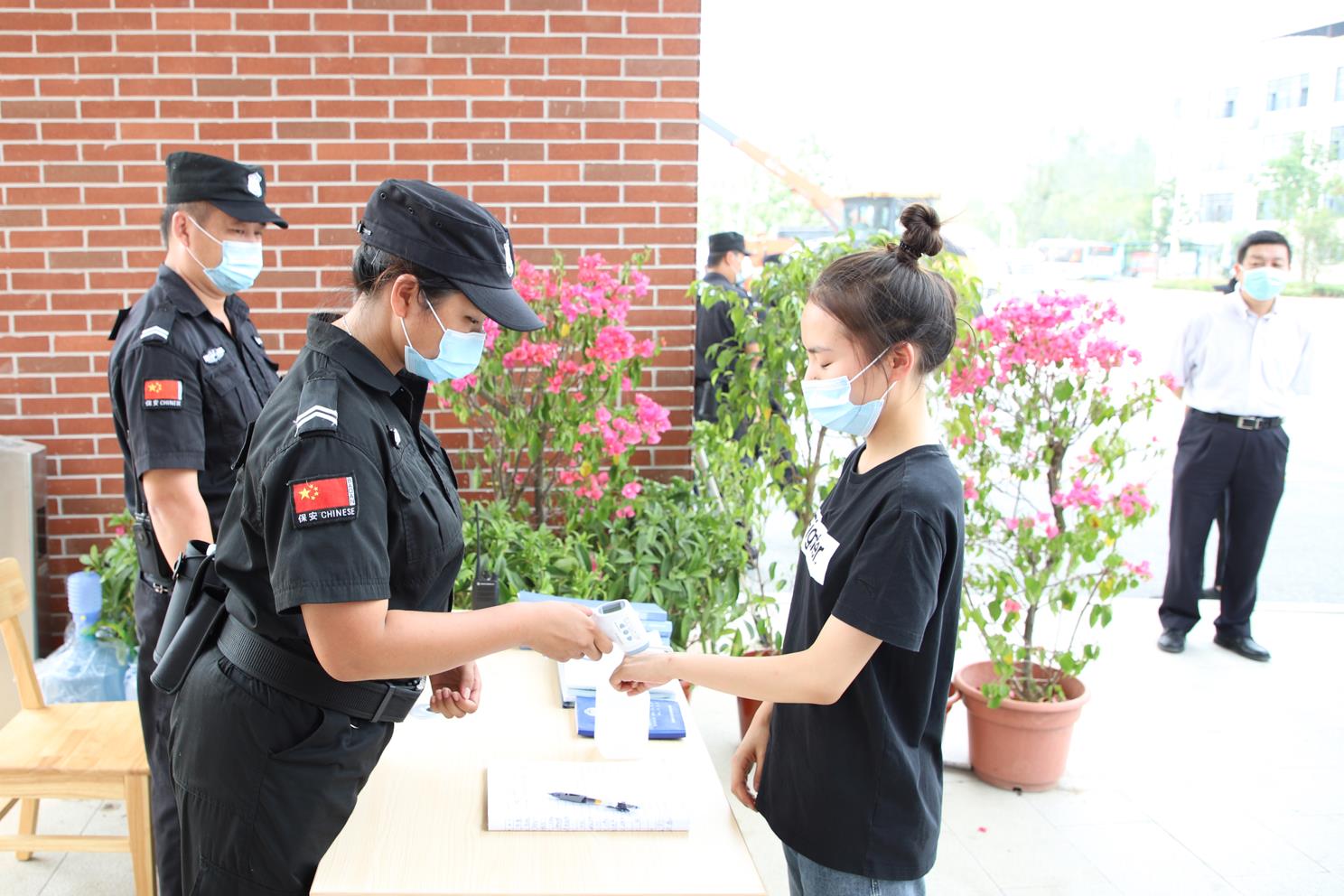 深圳校区西门安保人员对入校学生进行体温测量