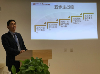 中医科学科带头人秦鉴教授提出了中医科建设的四点思考及“五步走”战略,他认为中医科要以学科建设为核心,建设研究型的中医科;要对标替代医学研究水平最高的德国和中国香港;要坚持文化自信,传承发扬优秀中医文化,在输出医疗服务的同时更要输出新的医疗技术、科研产品、新的中医理论。与此同时,他提出中医科的发展目标:加快科室筹备工作,认真执行落实医院下达任务,积极做好开科准备,正式开业并收满床位;争取2-5年在深圳确立行业地位;建成广东省中医特色专科;5-10年建成国家中医科示范单位;10-15年建成国家临床重点专科。