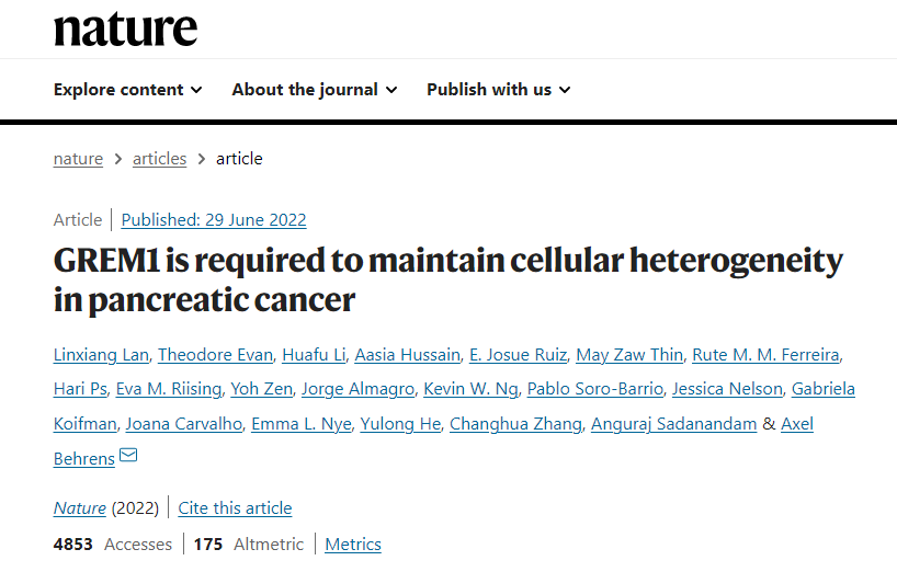 日前,我院何裕隆/张常华课题组与英国弗朗西斯克里克研究所合作培养的博士李华福(我院通过此项人才交流计划、与Behrens实验室共同培养的首位研究生)作为共同二作,与我院名誉教授AxelBehrens在国际顶刊Nature发表科学论文GREM1is required to maintain cellular heterogeneity in pancreatic cancer。