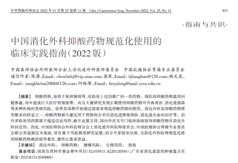 由中国医师协会外科医师分会上消化道外科医师委员会、中国抗癌协会胃癌专业委员会发起,中山大学附属第七医院(以下简称中山七院)消化医学中心组织实施的《中国消化外科抑酸药物规范化使用的临床实践指南(2022版)》近期发表在中华胃肠外科杂志。该指南是中国也是全球首部专门针对消化外科医生规范使用抑酸药物的循证临床实践指南,对于外科规范化用药具有重要指导意义。