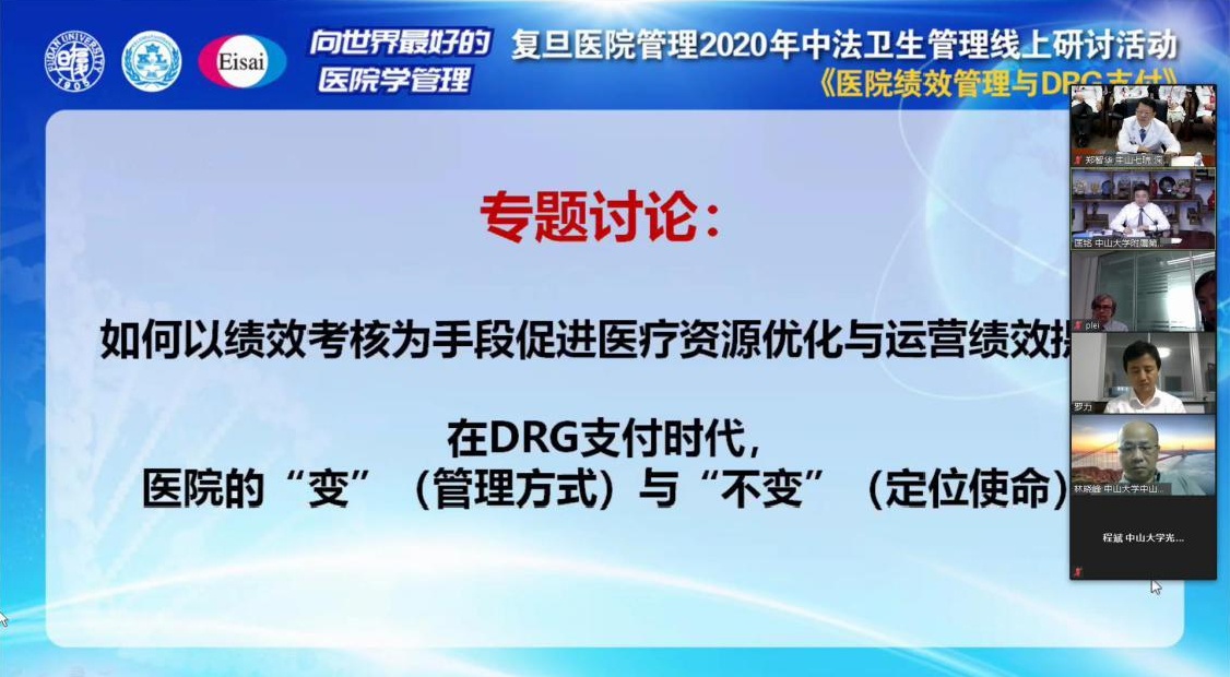 复旦大学医院管理研究所罗力副所长主持线上研讨会议,中山大学肖海鹏常务副校长对本次会议进行了致辞,并就《医院绩效管理考核》为主题进行了发言。法方Claude Lavigne先生与雷萍女士就《医院绩效管理与DRGS支付》为主题进行了深度分享。国家卫健委卫生发展研究中心医院管理与改革研究室黄二丹主任以《“十四五”医改回顾与展望:医疗卫生“十四五”规划与公立医院高质量发展》为主题,对比欧系列国家的公立医院,对我国公立医院的管理现状进行了发言。中山一院匡铭副院长以《“国考”赋能医院管理改革与提升——绩效国考对综合医院管理的启示》为主题进行了发言。中山大学肿瘤防治中心何韵党委副书记从《从绩效国考的重点谈专科专病绩效管理》视角阐述了该院专科专病的新型管理办法。中山大学附属孙逸仙纪念医院朱胤总会计师以《支付制度改革下的病种分析》为主题,对我国医院实行DRG支付相关内容进行了深度分享。