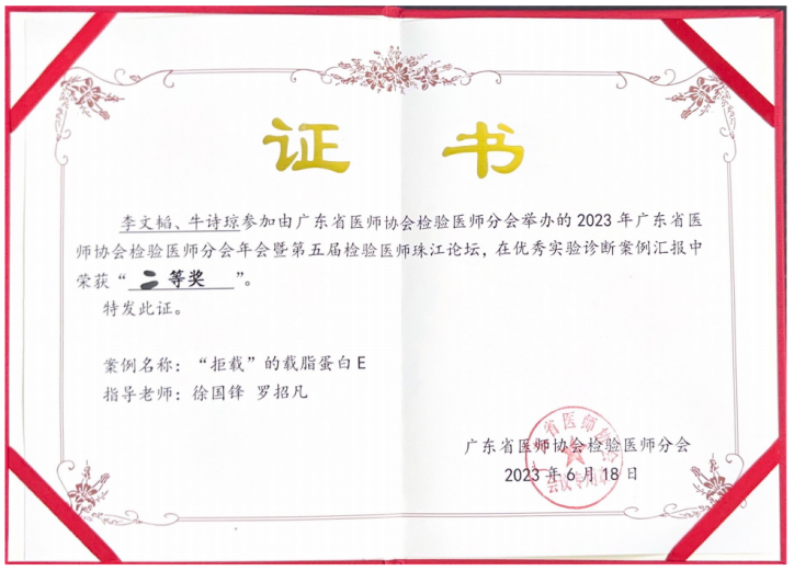 近日,2023年广东省医师协会检验医师分会年会暨第五届检验医师珠江论坛在广州召开,论坛同时举办广东省检验医师优秀实验诊断案例大赛。中山七院医学检验科李文韬主管技师、牛诗琼主管技师合作完成的临床检验案例《“拒载”的载脂蛋白E》最终斩获了全省二等奖的出色成绩。