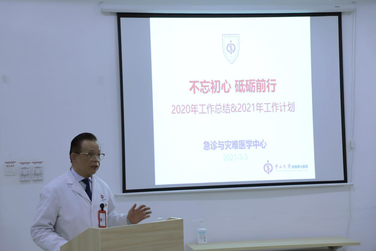 廖主任提到,在过去的一年中,急诊医务人员在抗击新冠的战斗中挺身在前,为抢救生命争分夺秒,体现了“排头兵”的勇气和担当。2020年急诊的就诊量、抢救量同比有明显的增加,急诊的全院全年教学工作量也取得了第一名的好成绩;成功申请到深圳市医学重点学科培育项目,为学科建设奠定了坚实的基础;急诊医学党支部在建设中山大学样板党支部的工作中获得了“优秀”的好成绩。2021年我们要抓住深圳市“双区驱动”的机遇,为大学、医院的“十四五”规划开局之年作出应有的贡献,以创三甲、重点学科建设、样板党支部建设和二期工程项目四个方面为抓手,实现学科建设的可持续发展。