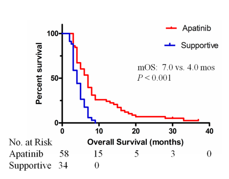 阿帕替尼组较对症支持治疗组明显提高了索拉非尼抵抗的晚期肝癌的总生存期(7个月vs.4个月,P<0.001)。