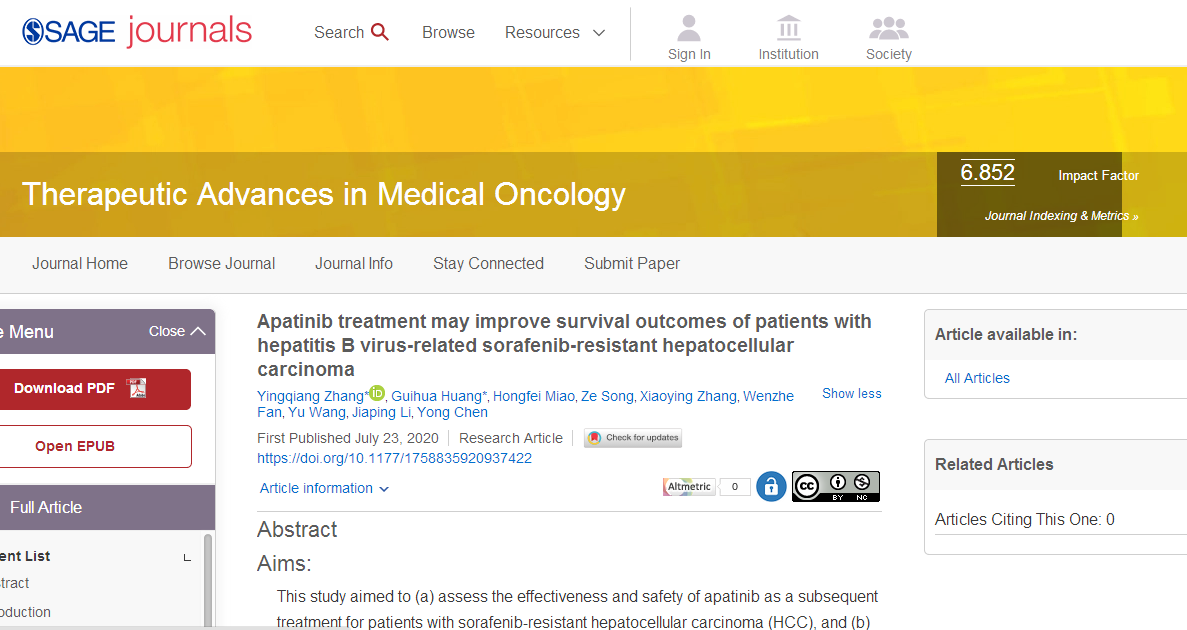 7月23日,我院肝癌介入微创综合治疗团队联合中山一院、南医大南方医院团队,在肿瘤学高水平期刊Therapeutic Advances in Medical Oncology( IF=6.852, Ranked 33 out of 321 in Oncology, 中科院II区, JCRQ1) 发表了原创性研究论文“Apatinib treatment may improve survival outcomes of patients with hepatitis Bvirus-related sorafenib-resistant hepatocellular carcinoma”(我院张应强主治医师为第一作者,通讯作者分别为其导师中山一院李家平教授,南医大南方医院陈勇教授)。该研究选取了索拉非尼抵抗无效的晚期肝癌患者为研究对象,改用二线阿帕替尼治疗后,较最佳支持治疗(Supportive Care)能明显提高患者生存期(mOS:7vs. 4 months, P<0.001),并通过进一步分层分析发现肝内肿瘤负荷(HR: 3.653, 95%CI: 2.047-5.965, P<0.001)及肝外转移(HR: 0.303, 95%CI: 0.231-0.778, P<0.001)是影响阿帕替尼疗效的关键因素。