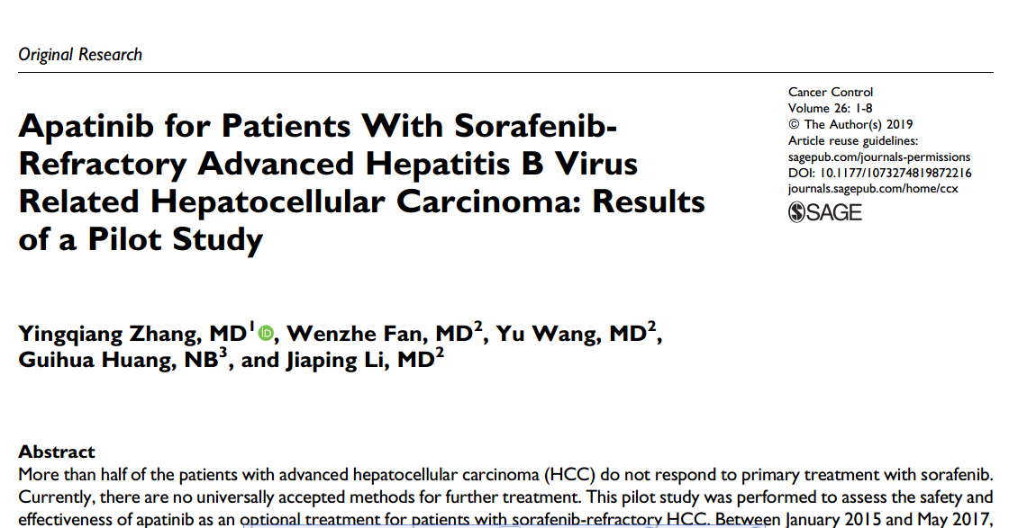 本系列研究自2015年开始,系国内最早探索阿帕替尼在索拉非尼抵抗的晚期肝癌中的应用,从最初的试验性研究初步探讨阿帕替尼二线治疗索拉非尼抵抗的晚期肝癌的安全性及有效性(研究结果已发表在Cancer Control.2019; 26(1): 1073274819872216. IF=3.103, "Apatinibfor patients with sorafenib-refractory advanced hepatisis B virusrelated hepatocellular carcinoma: Results of a pilotstudy"),以及受邀在2019中国介入放射学年会作学术报告,到如今的病例对照研究,均得到了国内外专家的认可,指出具有很好的临床指导意义,亟需开展RCT进一步验证其临床价值。