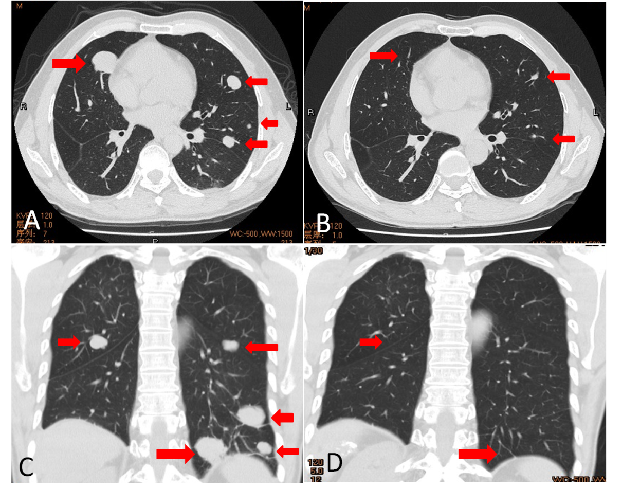 病例展示:一50岁男性,有慢性乙肝病史,AFP:2213ng/mL。胸腹部CT提示:肝内肿物伴双肺多发转移。肺肿物穿刺病理示:肝细胞癌。给予TACE联合索拉非尼治疗,治疗后复查提示:肺内病灶持续增大,增多,AFP持续增高。考虑索拉非尼抵抗无效,然后改用阿帕替尼治疗,经阿帕替尼治疗后病灶持续缩小,AFP持续下降,6个月后复查肺内病灶几乎全部消失。该患者对阿帕替尼响应良好,最后总生存期达38月。