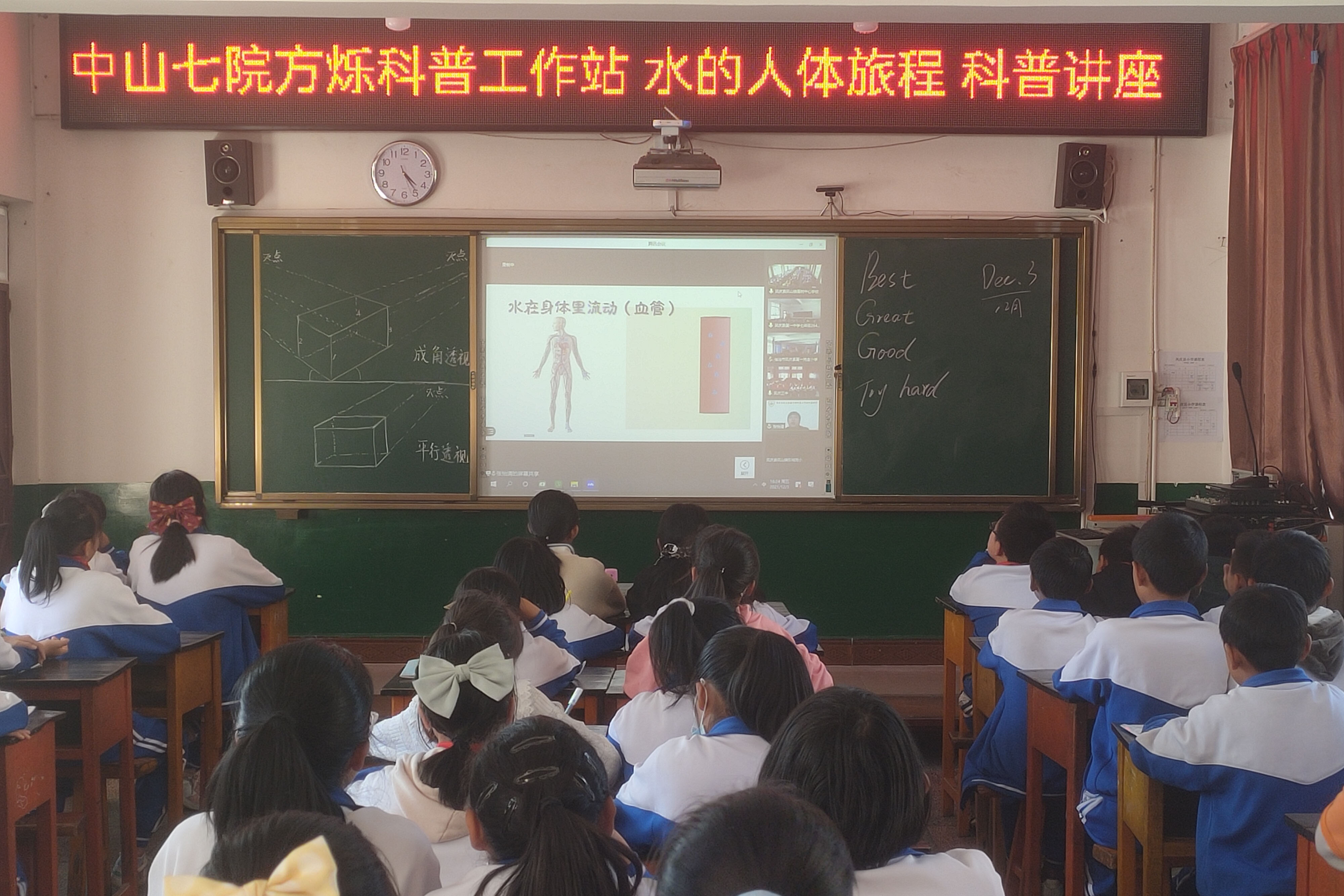 近日,中山大学附属第七医院方烁科普工作站为青树完小、滇红完小、青树中学、凤庆一中、凤庆二小、凤庆三中等六所凤庆县中小学开展第七期线上系列医学科普讲座,由中山大学附属第七医院肾内科主治医师张怡清博士讲解《水的人体旅程》,中山七院临床十一党支部书记方烁主持活动,带给400多名凤庆县师生一场精彩的线上科普盛宴。