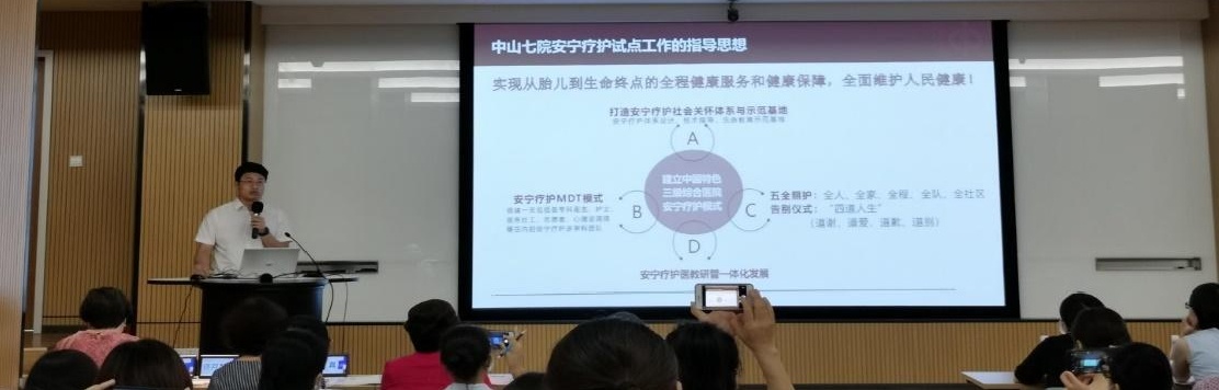我院消化医学中心二科护理负责人袁远护师作为代表发言。他提出,中山七院在何裕隆院长、苗伟书记的大力支持下,“做有温度的医院”是医院每一名医护人员的工作态度,以“全面动员,试点先行”的理念开展安宁疗护相关工作,以“实现从胎儿到生命终点的全程健康服务和健康保障,全面维护人民健康”作为我院安宁疗护试点工作的指导思想。他还对我院得安宁疗护试点工作做了全面的汇报工作并解读了2020年度深圳市安宁疗护实践基地的培训计划。