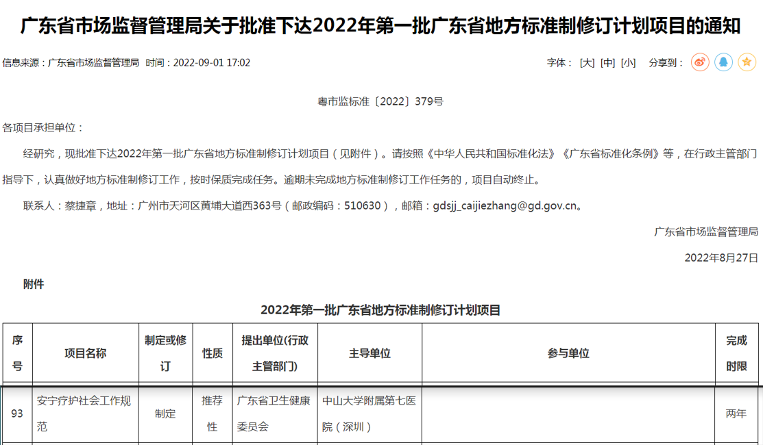 近日,广东省市场监督管理局公布了2022年第一批广东省地方标准制修订计划项目,共有95个地方标准制修订项目入选,其中广东省卫生健康委员会推荐的9个项目获批立项,包括了由中山大学附属第七医院(以下简称“中山七院”)申报和主导的《广东省安宁疗护社会工作规范》。这是继2022年5月医院《安宁疗护社会工作服务指南》获得深圳市地方标准项目立项后的又一突破性成绩,标志着中山七院的安宁疗护工作达到了引领广东省的先进水平。