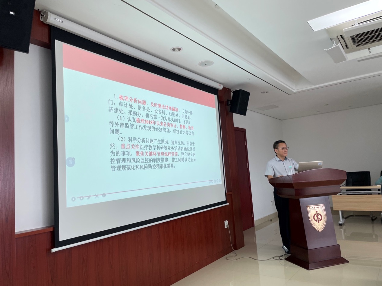 在医院内部控制建设方面,魏涛副处长向各部门介绍了财务处的内控建设情况,并以采购业务为例进行了风险点防控要点讲解,期望各部门按照管理实际及业务开展情况,完善修订各岗位业务流程内控防控措施,以此推动我院内部控制建设工作向前迈进。
