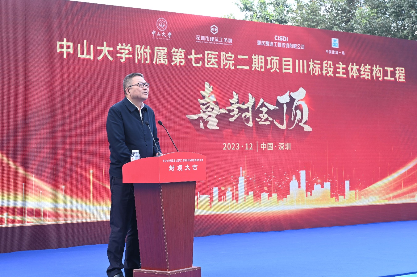 中山大学副校长邰忠智代表中山大学感谢参建单位同事们的努力工作,向七院全体医护人员致以诚挚祝贺。他表示,一流的城市要有一流的医院,深圳市和中山大学共同打造了新时代医疗卫生高地中山七院,医院二期项目作为超大型的医疗综合体,项目完成难度大,但经过各方齐心协力,提前3个月取得了骄人成绩。“旧岁已展千重锦,新年再进百尺竿”,值此封顶仪式,邰忠智副校长表达了对二期项目的期待:一是持续落实党的二十大关于高质量发展要求,希望后续建设过程中继续保持昂扬的工作态度,扎实务实的工作作风;二是持之以恒久久为功,参建单位要以归零的心态、冲刺的姿态、赶考的状态和群众的期盼转化为建设动力,全力以赴投入到二期项目建设中;三是新的阶段,整装待发,二期项目进入装饰装修阶段,七院和建设方要加强协调联动,保持积极沟通,攻坚克难,共同把七院二期项目打造成城市杰作、时代精品。