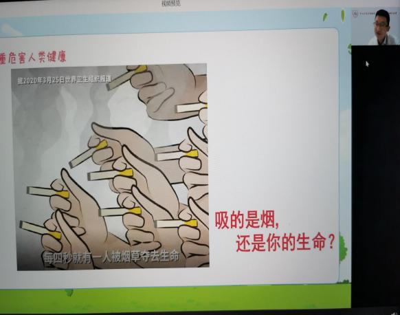 少一支灰色的烟,多一片蓝色的天。我院国际合作与交流科李融科长则讲授《拒绝第一支烟、做不吸烟的新一代》的科普新主题,李融科长从烟草的黑暗营销史、青少年吸烟的原因、吸烟的危害、如何拒绝烟草的诱惑等方面图文并茂地为同学们讲授,倡导同学们要拒绝烟草的诱惑,吸烟和“酷”、“帅”、“时尚”这些没有必然的联系,但吸烟一定会伤害身体。遇到有人吸烟或有烟味的环境,要远离。勇敢主动地提醒吸烟者不可以在禁烟区吸烟,积极劝解身边吸烟的亲朋好友戒烟,给予他们支持和鼓励。最后倡导同学们“让我们远离烟草,从你我做起,人人都是控烟小卫士,做不吸烟的新一代”。李科长通过视频、图文等形式让同学们深刻认识吸烟的危害,在随后的科普讲座活动反馈调研中,同学们都纷纷表示要做控烟小卫士。