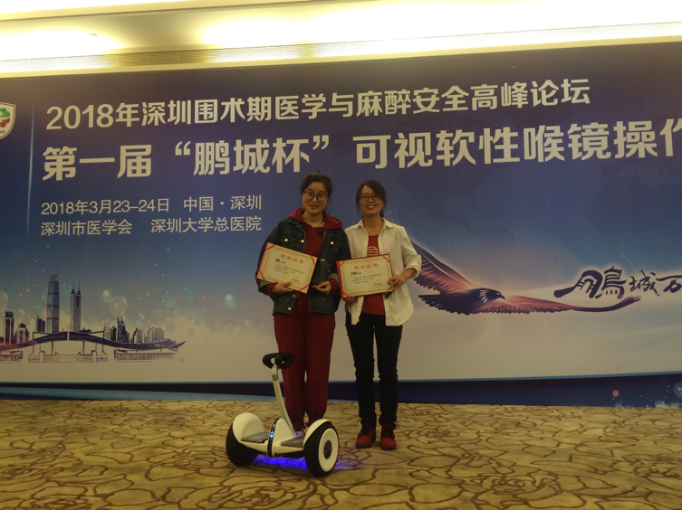 3月24日,由深圳市医学会、深圳大学总医院举办的“2018年深圳围术期医学与麻醉高峰论坛”在西丽湖畔举行。中山七院手术麻醉中心谭芳、朱茜茜两位医生在第一届鹏城杯可视软性喉镜操作技能大赛中分别荣获比赛一、二等奖。