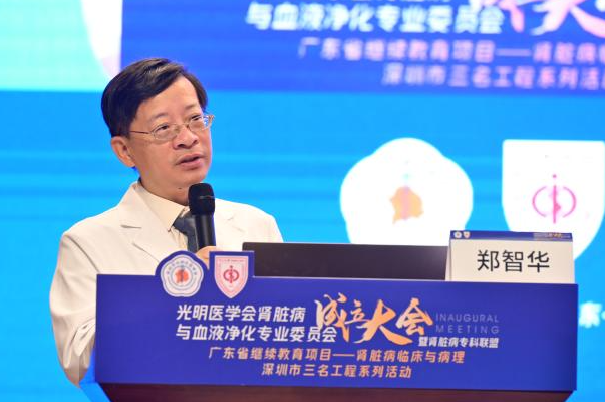 专委会主任委员中山七院副院长郑智华发言表示,专委会将成为光明区各级医疗机构肾脏病与血液净化工作者的合作纽带,在开展肾脏病学术交流的同时,促进肾脏病学科建设和人才的成长,规范肾脏病诊疗水平,促进肾脏病诊治技术的同质化、规范化管理。同时,利用北京协和医院、中山一院和中山七院强强联合的优势,重点打造深圳市光明区的介入肾脏病MDT团队和特色亚专科,使深圳患者血液净化治疗复杂的血管通路建立和维护全部在深圳完成;将通过双向转诊、双线合作等形式,切实加强与光明各级医院紧密联系,辐射带动周边医院疑难肾脏病诊治水平;通过合作举办肾脏病相关学习班,加强与全国高水平医院的合作交流,运用兄弟医院优质的教育和医疗资源,加强光明区肾脏病医护队伍的医教研建设。
