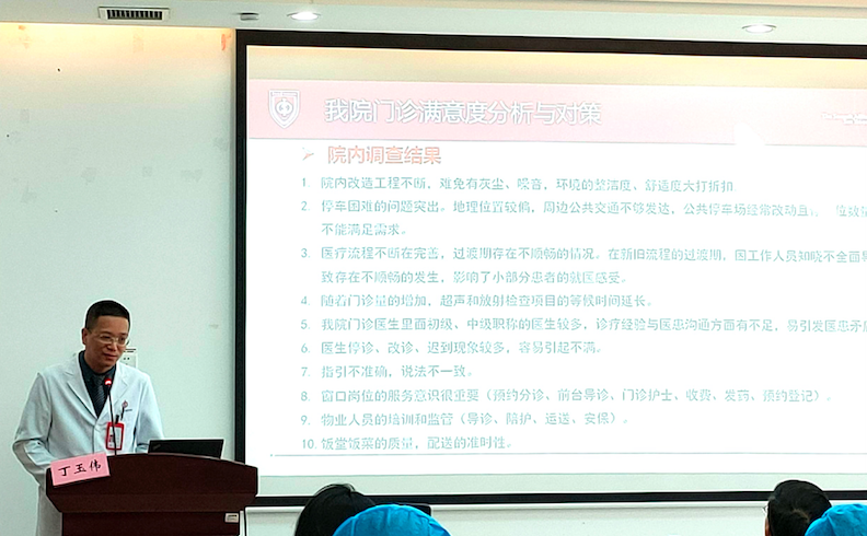 在培训中,医患关系科丁玉伟副科长分析了我院门诊患者的国家公立医院绩效考核、深圳市公立医院绩效考核和院内满意度调查考核情况,以及13个诊区分诊护士、前台导诊满意度评价分数。他从塑造护理和导医人员个人职业形象、规范护理和导医人员工作服务行为、树立服务意识、摆正服务态度以及用心、主动、细心做好服务等角度,对提升患者满意度提出对策建议。