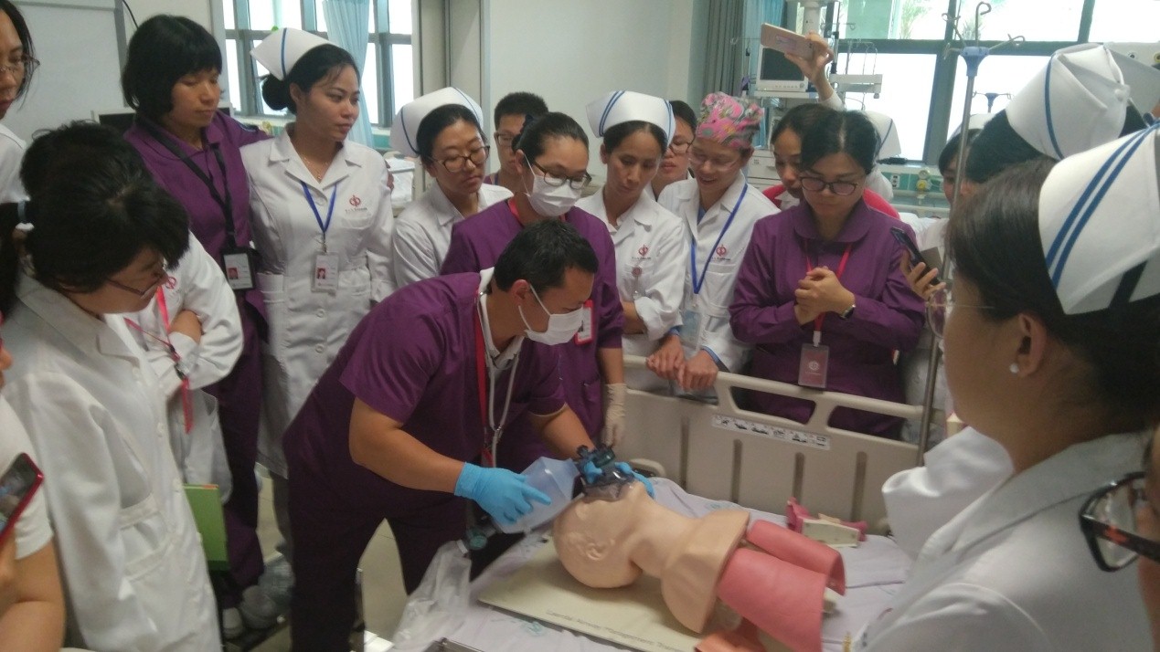 急诊科黄建茂老师为大家示范气管插管,一边讲解、一边演示操作的要点和技巧。
