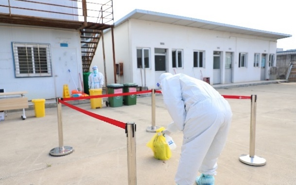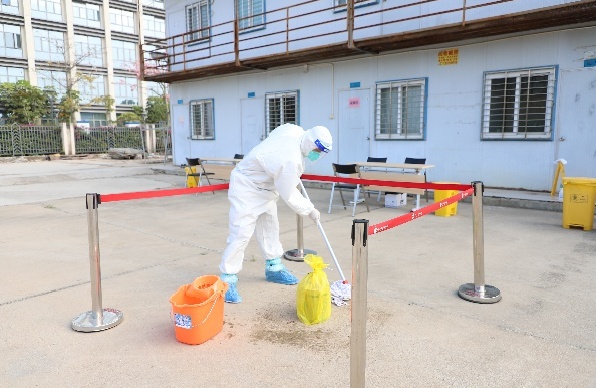 保洁人员立即赶到现场,穿着工作服,戴口罩、帽子等防护用品按要求处置医疗废物,整个过程行动迅速、紧张有序,及时有效的控制住了医疗废物泄露、扩散。