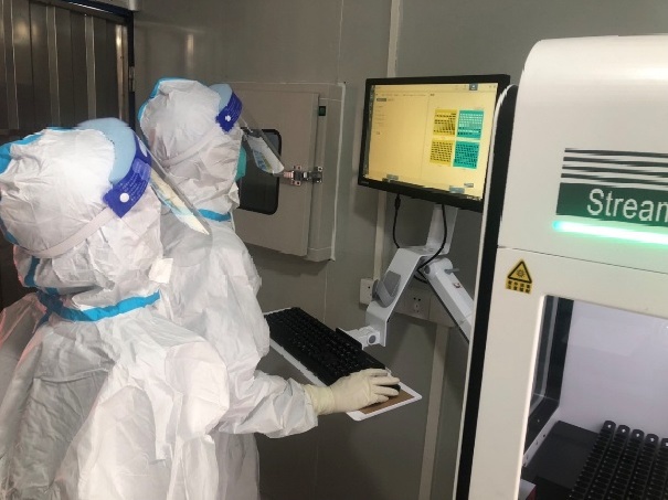检验科牵头,科研中心、病理科全力配合,紧急抽调9人组成核酸检测队伍,3人一组轮替上岗,在检验科罗招凡主任的组织带领下,自8点半至晚上11点半共持续检测15小时,共完成1600份模拟样本检测,向我院日核酸检测最大量的能力储备要求不断靠近。